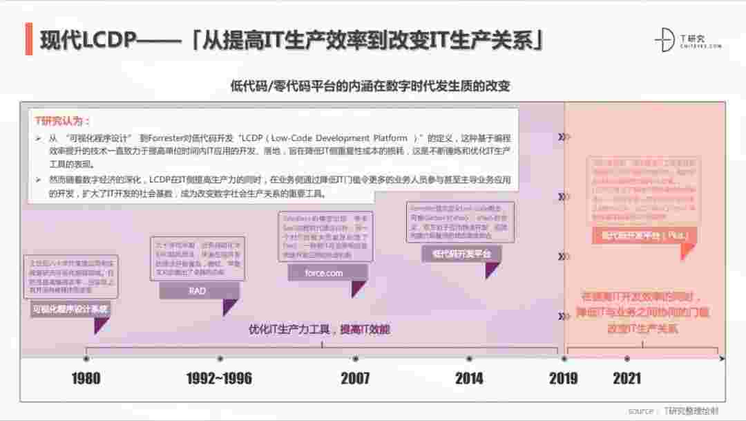 2020年前后,,源于提高IT工作者开发效能的LCDP不断进化和衍生,,,面对业务导向日益明显的数字化变革。。。。LCDP衍生出了面向不同对象的升级服务——面向专业人群的LCDP和业务人群的NCDP,,,,LCDP与NCDP的不同服务属性被逐渐认可和接受。。。 LCDP在提高IT开发效率的同时,,降低IT与业务之间协同的门槛改变IT生产关系。。